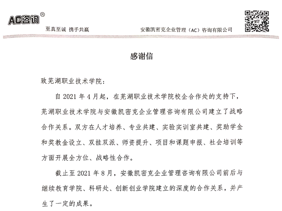 日前,为感谢学校在人才培养、专业共建、实验实训室共建、奖助学金和奖教金设立、双挂双派、师资提升、项目和课题申报、社会培训方面所做出的努力,安徽凯密克企业管理(AC)咨询有限公司专程给学校送来感谢信。