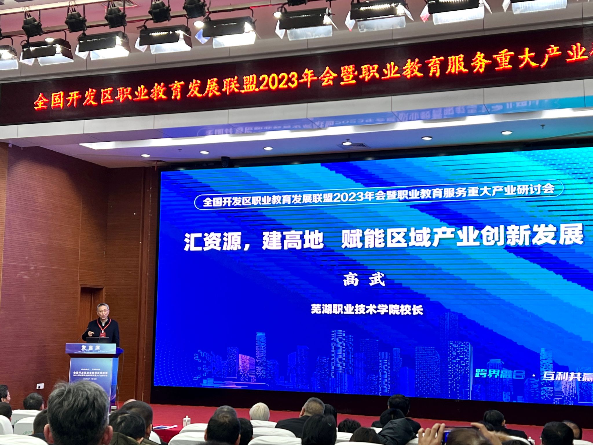 12月23日,由全国开发区职业教育发展联盟主办,宣城职业技术学院、宣城经济技术开发区承办,江苏中教科信息技术有限公司、开发区职业教育研究院协办的全国开发区职业教育发展联盟2023年会暨职业教育服务重大产业研讨会在宣城召开。此次活动以“跨界融合 互利共赢”为主题,相关政府部门领导、开发区协会负责人,联盟学校、企业、科研院所负责人,产业与职教领域专家学者等百余人齐聚一堂,旨在深入贯彻落实《关于深化现代职业教育体系建设改革的意见》协同推进职业教育产教融合走深走实,共话职业教育服务重大产业新路径。高武院长代表芜湖职业技术学院在会上以《汇资源,建高地 赋能区域产业创新发展》为主题分享建设成果。