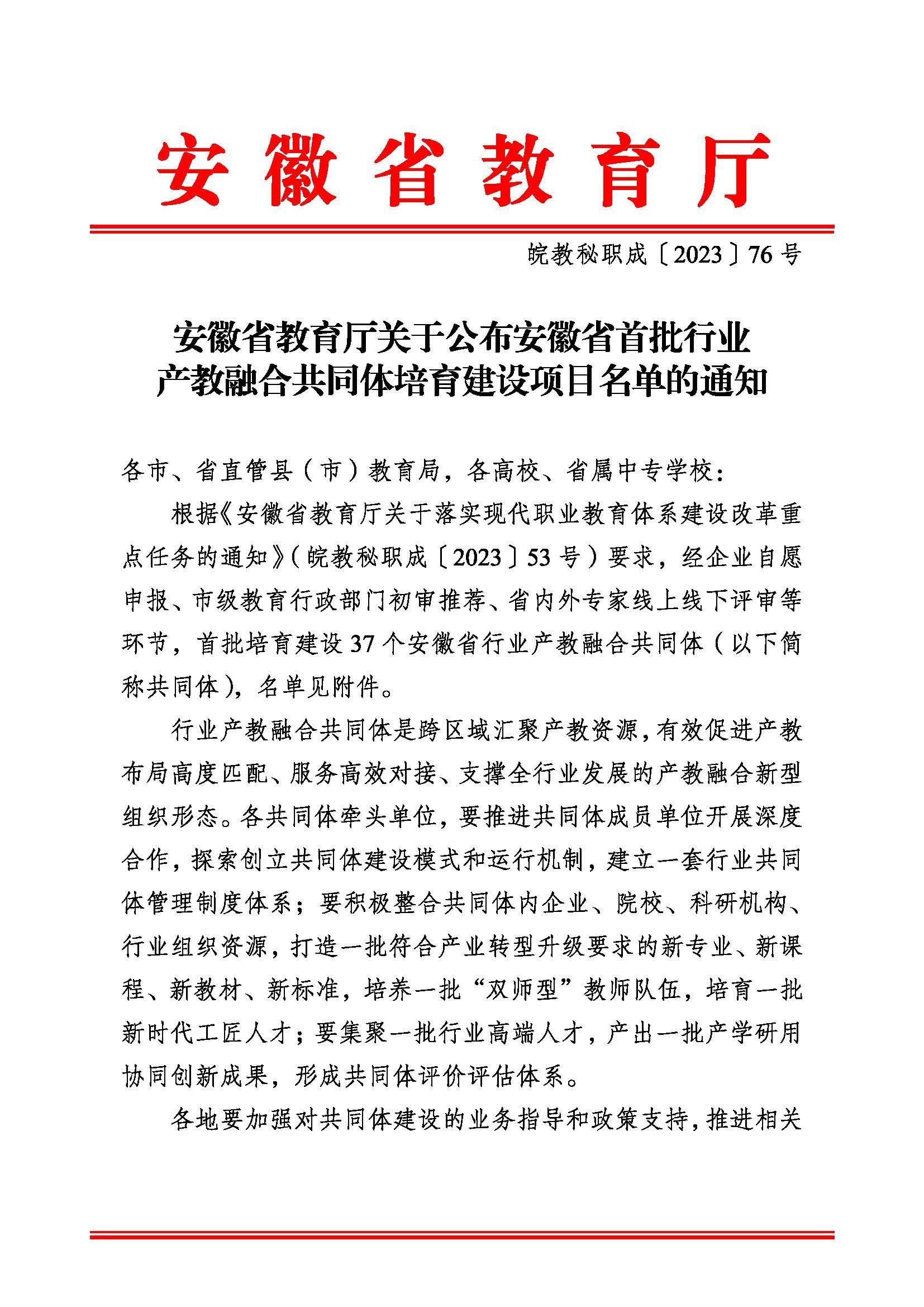 近日,安徽省教育厅发布《关于公布安徽省首批行业产教融合共同体培育建设项目名单的通知》(皖教秘职成〔2023〕76号),根据《安徽省教育厅关于落实现代职业教育体系建设改革重点任务的通知》要求,经企业自愿申报、市级教育行政部门初审推荐、省内外专家线上线下评审等环节,共评选出37个首批培育建设的安徽省行业产教融合共同体。